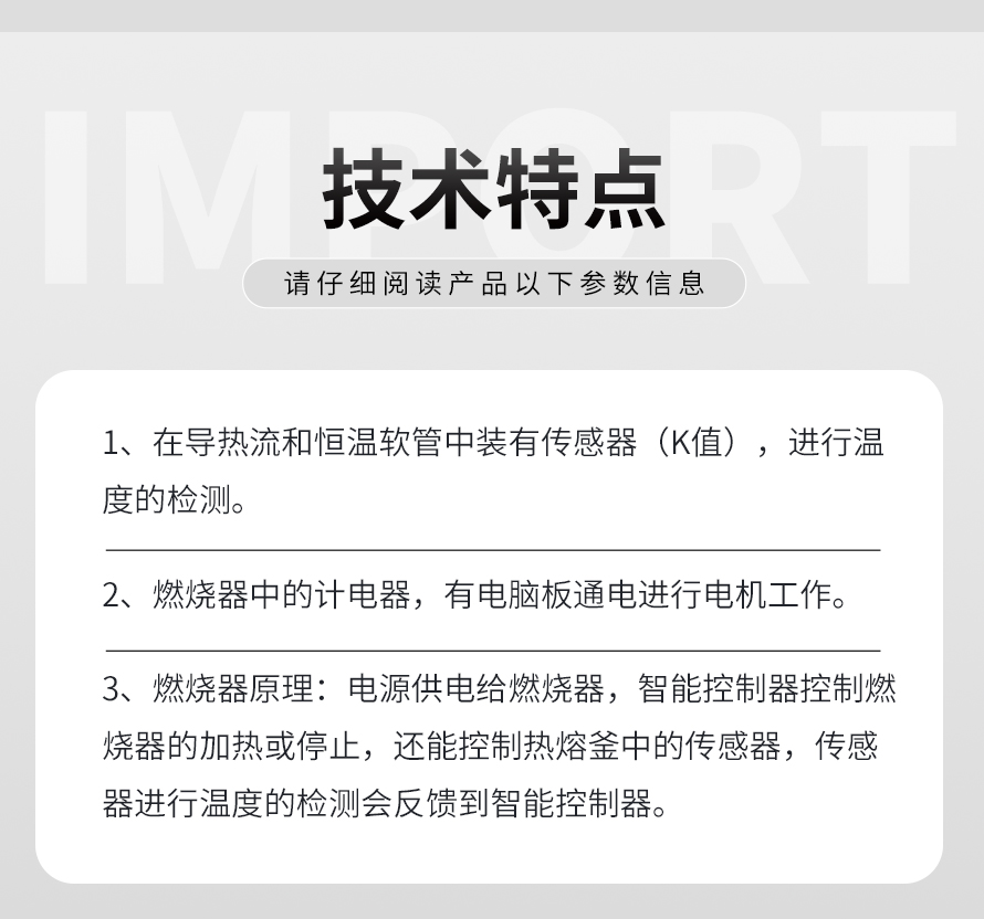 燃燒器原理:電源供電給燃燒器,智能控制器控制燃燒器的加熱或停止,還能控制熱熔釜中的傳感器,傳感器進(jìn)行溫度的檢測會反饋到智能控制器。